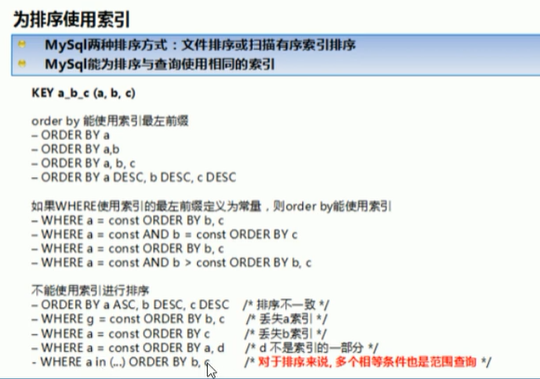 - order by违反索引的最左前缀法则,或者包含非索引字段会导致文件排序。