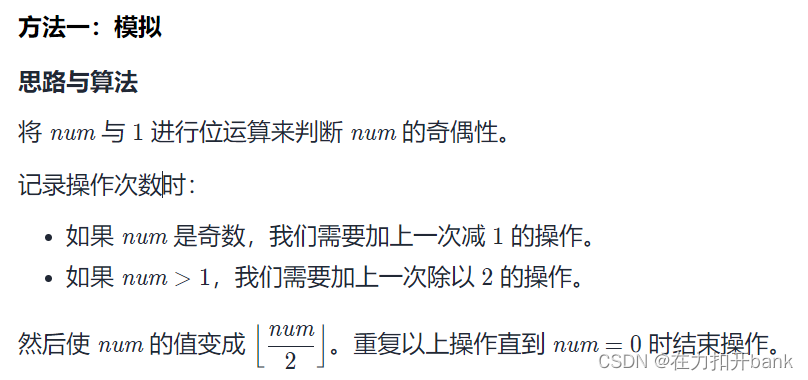 | 给你一个非负整数 num,请你返回将它变成 0 所需要的步数。 如果当前数字是偶数,你需要把它除以 2 ;否则,减去 1 。 示例 1: 输入:num = 14输出:6