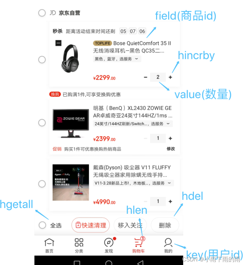 以用户id为key,商品id为field,商品数量为value,恰好构成了购物车的3个要素。