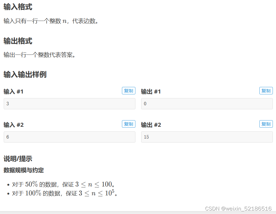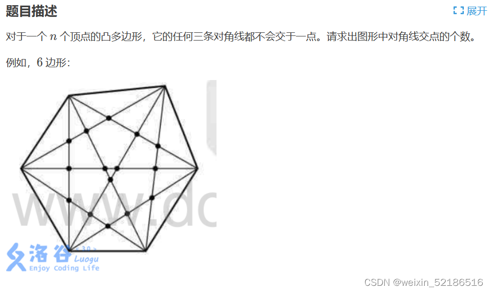 一条边是由2个顶点组成,每个交点需要2条边,即需要4个顶点组成一个交点,所以问题转化为计算n个顶点中有多少个4个顶点的组合。使用组合公式即可求出,此时可以化简组合公式为n * (n-1) / 2 * (n-2) / 3 * (n-3) / 4 ,但数据使用int类型范围过小,使用long也会出现部分数据不通过的情况,所以使用麻烦的BigInteger。