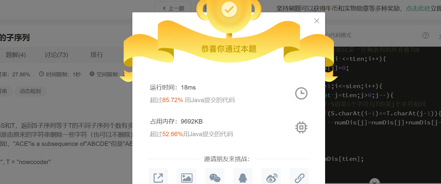 状态:F(i,j): S[1:i]中的子串与T[1:j]相同的个数 递推公式: 在F(i,j)处需要考虑S[i] = T[j] 和 S[i] != T[j]两种情况 A.当S[i] = T[j]:: (1)让S[i]匹配T[j]则 F(i,j) = F(i-1,j-1) (2)让S[i]不匹配T[j],则问题就变为S[1:i-1]中的子串与T[1:j]相同的个数,则 F(i,j) = F(i-1,j) 故S[i] = T[j]时F(i,j) = F(i-1,j-1) + F(i-1,j) B.当S[i] != T[j]: 问题退化为S[1:i-1]中的子串与T[1:j]相同的个数 故,S[i] != T[j]时F(i,j) = F(i-1,j) 初始化:引入空串进行初始化 F(i,0) = 1 —> S的子串与空串相同的个数,只有空串与空串相同 返回结果:F(m,n)
