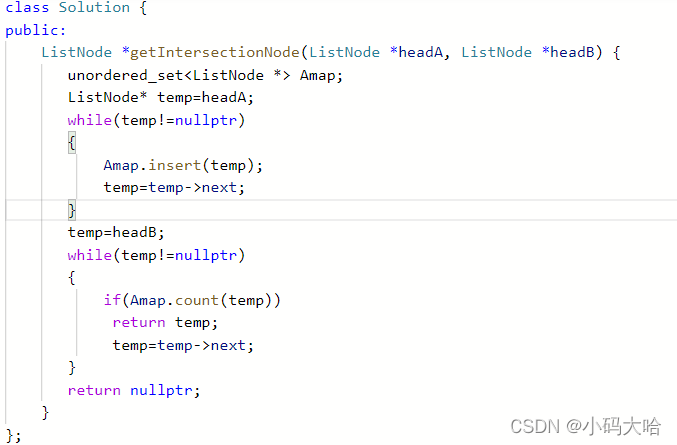 思路1:哈希集合——首先我们可以想到,如果我们把链表A存到数组里面,再对B进行遍历,同时与数组对比,即可完成提议,但是时间复杂度为O(n*n);过于复杂,优化一下,我们可以考虑用哈希集合(相关内容可以参考(3条消息) 【数据结构与算法】初入数据结构的哈希表(Hash Table)_长路漫漫的歇脚处-CSDN博客),利用哈希集合我们可以把时间复杂度优化到O(m+n),空间复杂度为O(m);