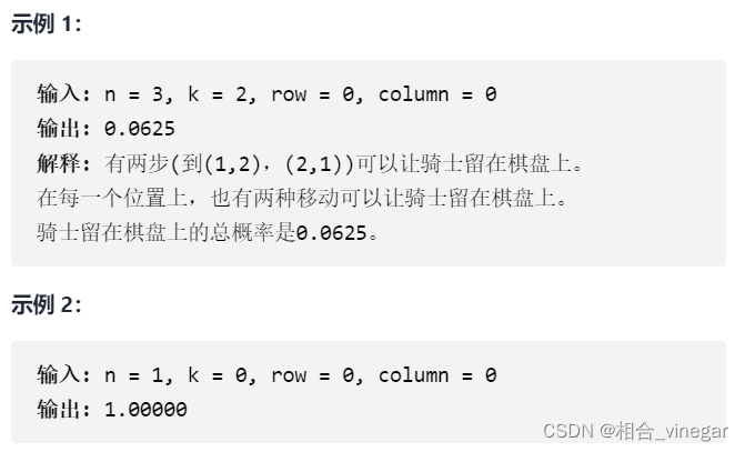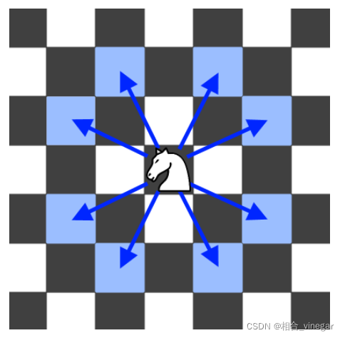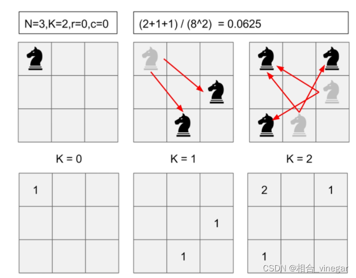 在一个 n x n 的国际象棋棋盘上,一个骑士从单元格 (row, column) 开始,并尝试进行 k 次移动。行和列是 从 0 开始 的,所以左上单元格是 (0,0) ,右下单元格是 (n - 1, n - 1) 。象棋骑士有8种可能的走法,如下图所示。每次移动在基本方向上是两个单元格,然后在正交方向上是一个单元格。每次骑士要移动时,它都会随机从8种可能的移动中选择一种(即使棋子会离开棋盘),然后移动到那里。————故概率的分母是8^k(8的k次方)骑士继续移动,直到它走了 k 步或离开了棋盘,返回骑士在棋盘停止移动后仍留在棋盘上的概率。
