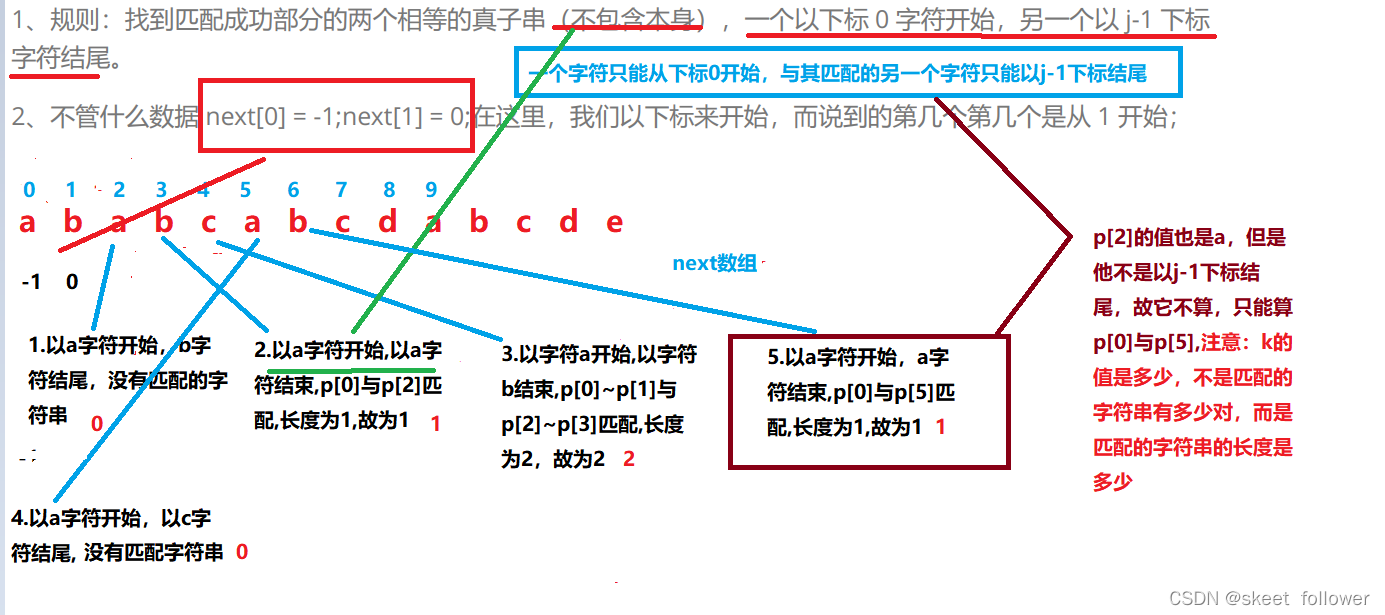 - ?规则:找到匹配成功部分的两个相等的真子串(不包含本身),一个以下标 0 字符开始,另一个以 j-1 下标字符结尾。