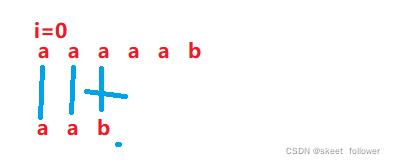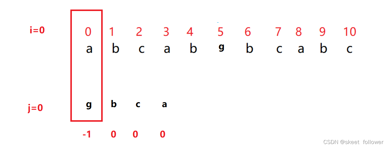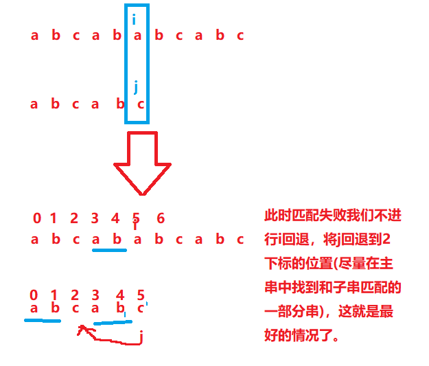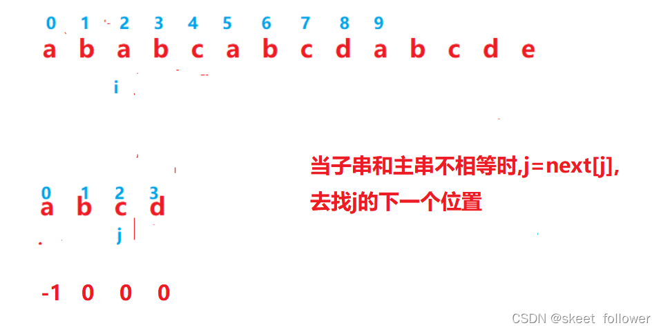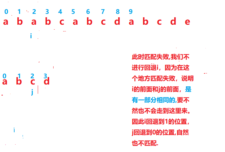 b和d不相等,那就把i指针回退到刚刚指针的下一个位置(刚刚指针是从0下标开始的),j指针退回到0下标重新开始。