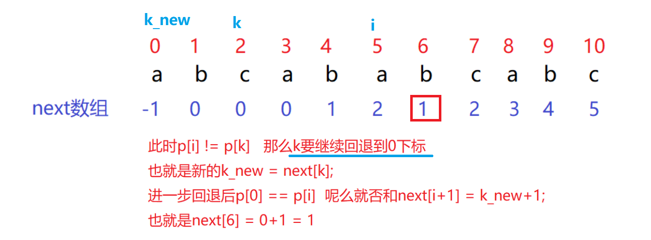 这个知识点上面讲过,当p[j]!=p[k]时候,k回退,一直找到p[j]==p[k]然后用这个next[i+1]=k+1;