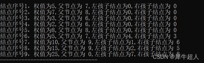 printf("\n结点序号%d,权值为%d,父节点为 %d,左孩子结点为%d,右孩子结点为 %d",i,ht[i].weight,ht[i].parent,ht[i].lchild,ht[i].rchild);