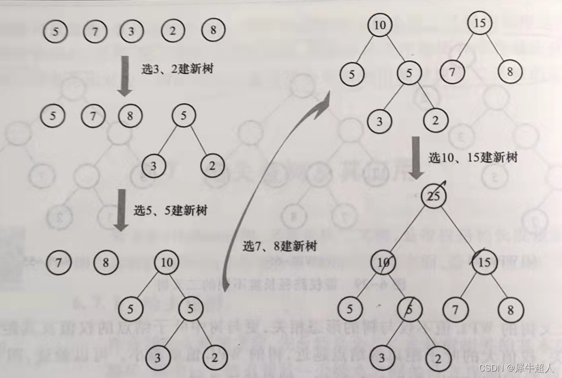 通俗来讲,就是在一堆数字中,选取最小的两个当叶子节点,他们的加和为他们的父结点。
