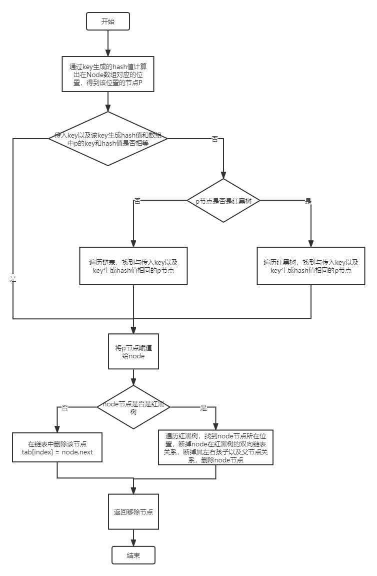 // 遍历链表,找到key和hash值与传入参入相同的节点,即为要删除的节点