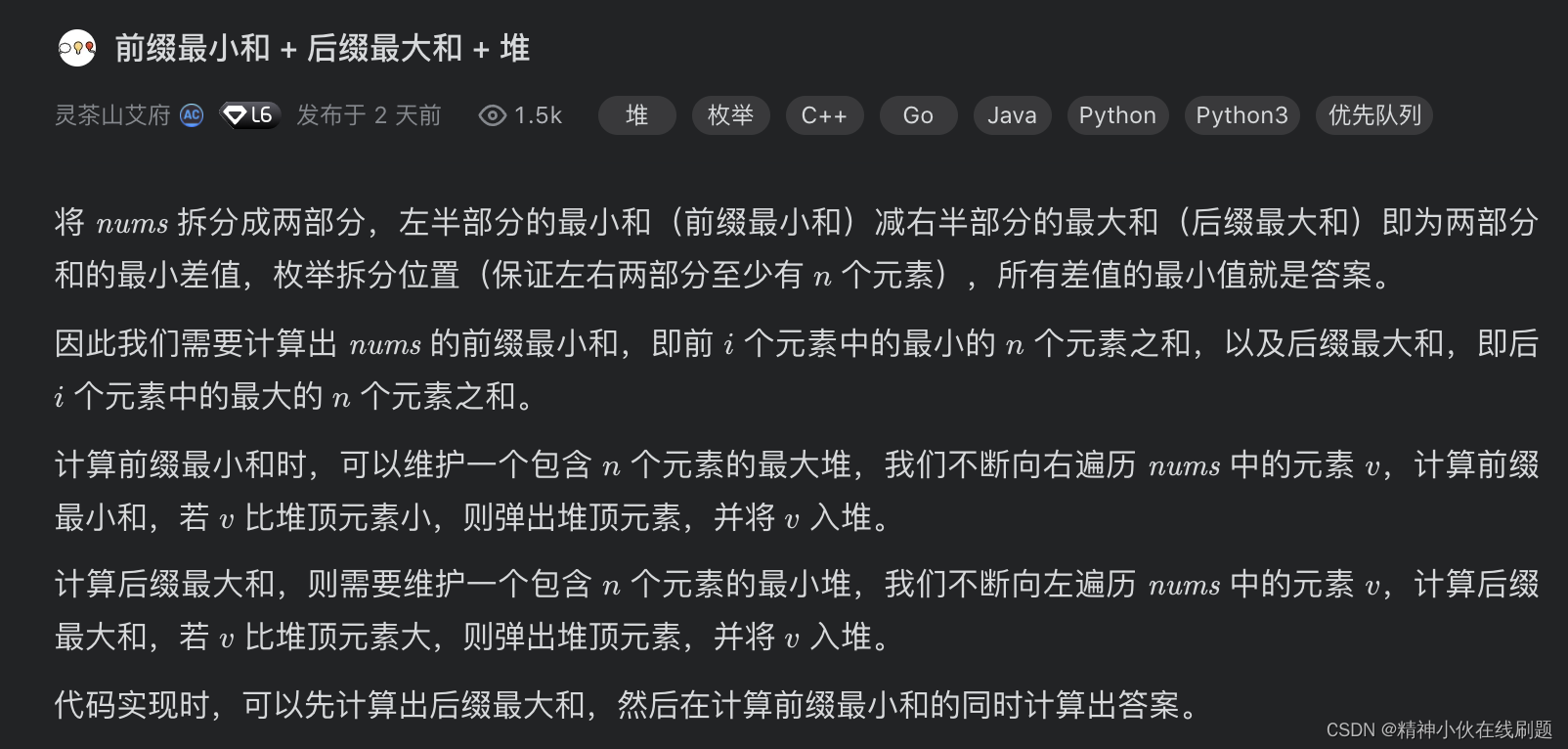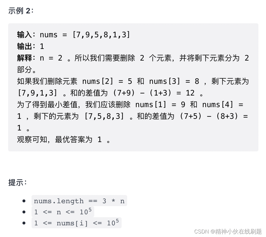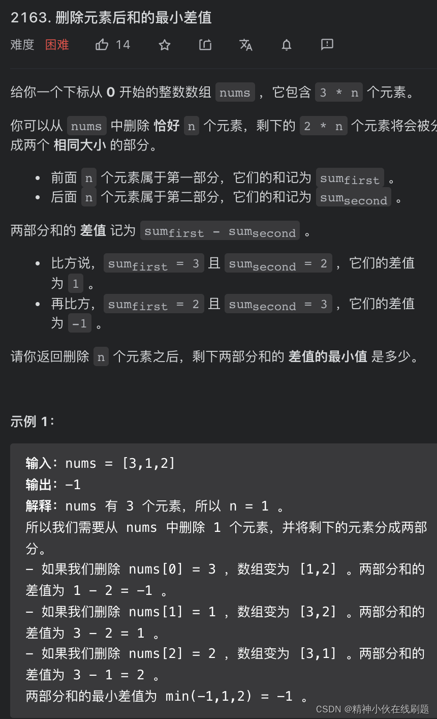 链接:https://leetcode-cn.com/problems/minimum-difference-in-sums-after-removal-of-elements/solution/qian-zhui-zui-xiao-he-hou-zhui-zui-da-he-yz3d/