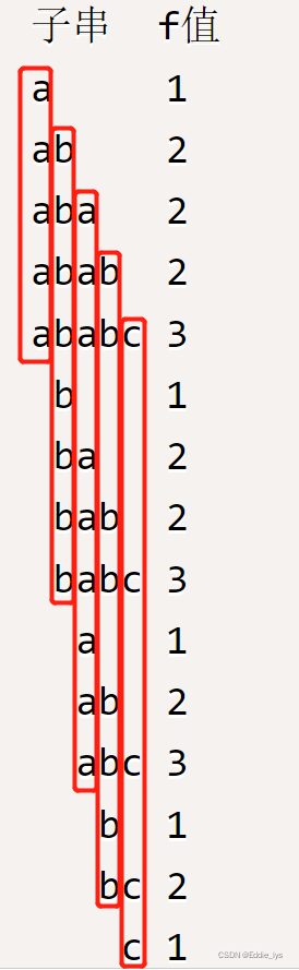 ? ? ? ? ?对于字符串 ababc 来说,出现的次数为 5 次,均在以 a 为开头的字串中,以此分析下去可以发现每一个字符在对应字串中出现的规律,可以设计处解题算法。该算法的 Java 实现如下: