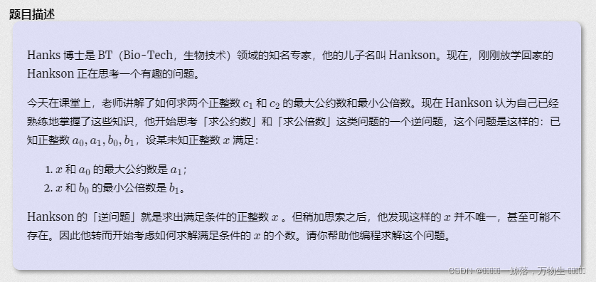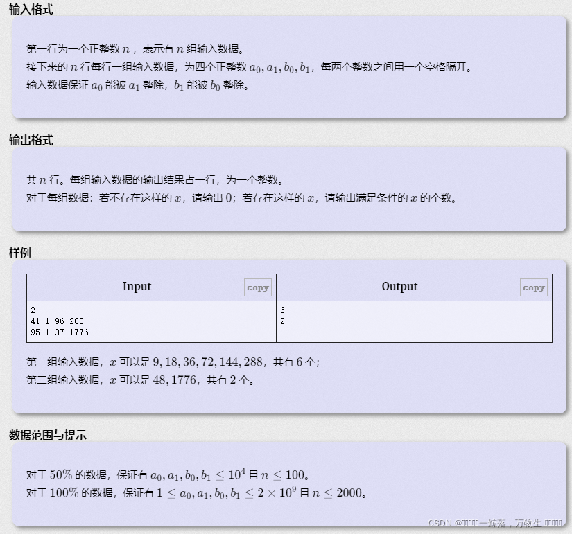 因为x和b0的最小公倍数是b1,所以x一定是b1的约数,我们可以枚举出b1所有的约数,依次对给定的2个条件进行判断,如果符合条件答案加一,现在的问题是如何枚举b1的所有约数,如果暴力从1开始枚举必定会超时,稍微改进一下采用试除法,其时间复杂度为: ,依旧会超时,再次改进,我们可以先求出根号2e9内的质数,用这些质数对b1进行质因数分解,得到其质因子和相应的次数,通过质因子和次数可以将b1所有的约数枚举出来判断条件即可,这里先普及一个知识点,1~n中的质数的个数约为n/ln(n)个,所以这样做的时间复杂度为: ,这样一来时间复杂度终于是足够了,下面就是激动人心的实现环节了。