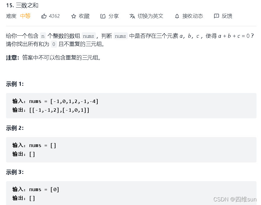 如果是求两数之和,可以先对数组排序,然后用双指针,从两头开始遍历,那么对于三数之和,我们可以先确定一个数,然后用解决两数之和的办法,用双指针求另外两个数。需要注意的是题目要求答案中不能包括重复的三元组,所以我们在遍历的过程中要去重。