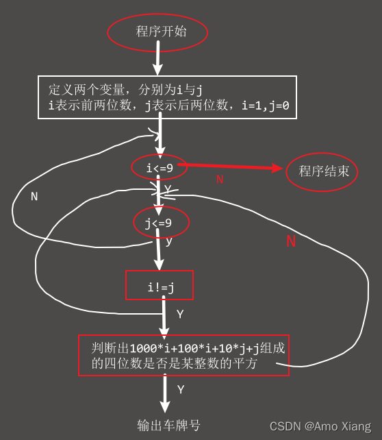 本练习是数值计算问题,求解不定方程。对于这种求解不定方程组的问题,一般采用穷举循环,首先设计双层循环 (需要根据实际情况思考几层循环)穷举出所有由前两位数和后两位数组成的4位数车牌,然后在最内层穷举出所有平方后值为4位数并且小于车牌号的数,判断该数是否与车牌相等,若相等,则打印车牌。