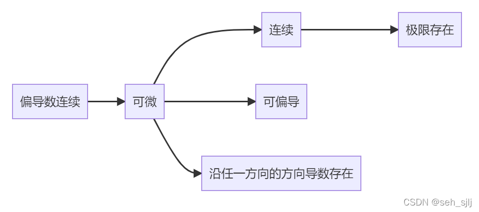 综合以上所有讨论,得到下面这张图:  可以看出偏导数连续是最强的条件,可微是很强的条件,(任意方向)偏导数存在是很弱的条件。