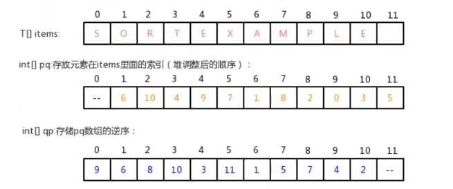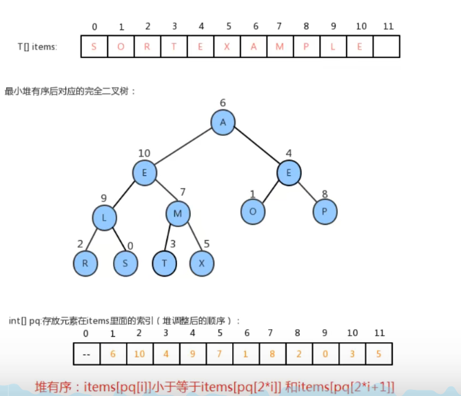 2、完成上一步后,虽然给每个元素关联了一个整数,并且可以使用这个整数快速获取到该元素,但是items数组中元素都是随机的,并没有按照从小到大或者从大到小的顺序排列好,为了排好序,增加一个数组int[] pq来保存每个元素在items数组中的索引,通过让pq数组变有序,使得在拿到items数组中的元素时也是有序的,举例来说就是pq[1]对应的数据元素items[pq[1]]要小于等于pq[2]和pq[3]对应的数据元素items[pq[2]]和items[pq[3]]。