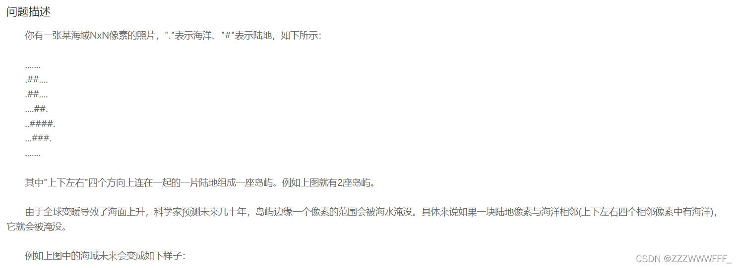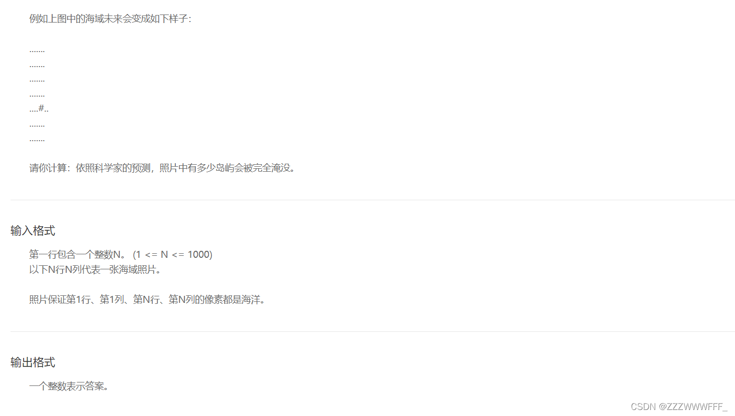 思路上:我们就遍历整个照片,如果遇到# ,我们即遇到岛屿了,那么我们就搜索这个岛屿(用book数组记录走过的地方)并给岛屿标号,同时我们查看这个岛屿上有没有四个方向都是陆地的,如果有那么我们就把以该岛屿号码为下标的数组++(即记录每个岛屿上四个方向都是陆地的地方的数量),最后我们遍历该数组,如果出现有岛屿没有有四个方向都是陆地的地方的话,那么ans++,最后输出ans即可