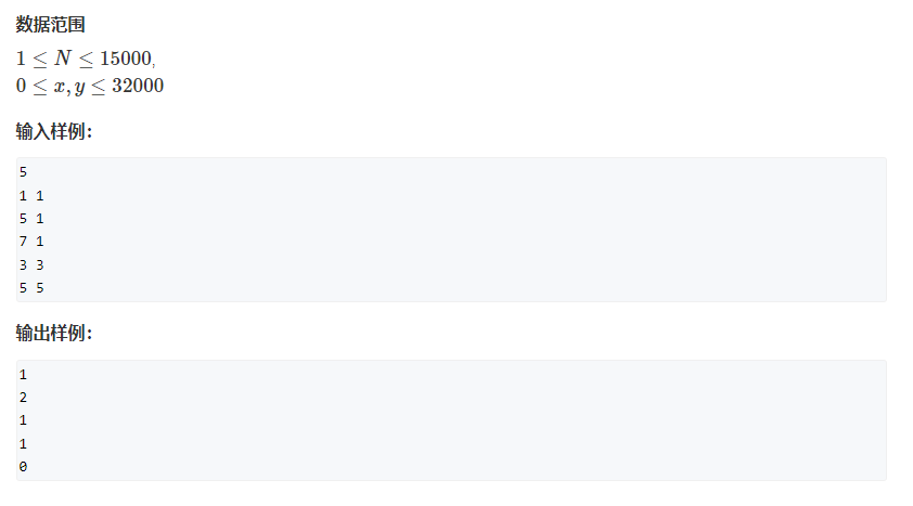注意:树状数组是从1开始的,而题目的给定的x范围是0≤x≤32000 ,因此需要将所有的x赋值成x + 1 (相对位置不变)