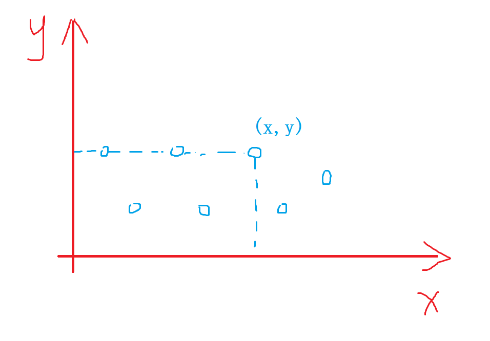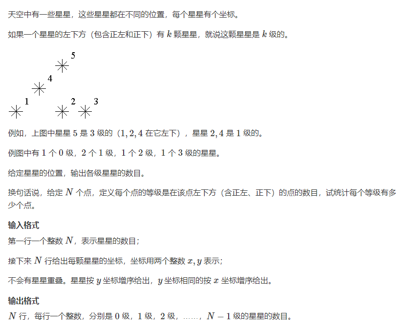 数星星   思路 暴力 – 优化 – 学以致用 1、题目要求求某一个点(x,y) 左下方星星的个数(不包括自己),且星星按y坐标增序给出,y 坐标相同的按x坐标增序给出,因此对于每个新来的点(x,y) ,y是当前纵坐标的最大值,只需要求[1,x] 中星星出现的数量即可