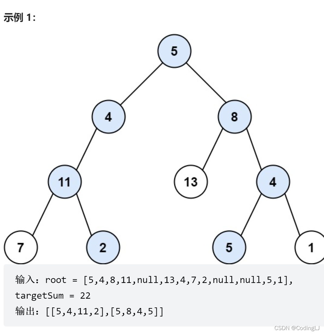 如果root.left不为null,那么递归,并且里面的参数改变为target - root.val,每次递归都减下,最后一个元素的值如果等于0的话,那就将将path添加到结果集中。