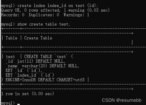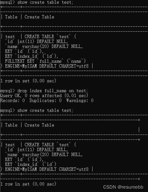 ?这里发现,首次创建失败,失败的原因有两个,一个是当前表test的存储引擎是InnoDB而不是MyISAM,第二点是全文索引的字段数据类型必须是CHAR、VARCHAR、TEXT等类型。经过修改创建成功。