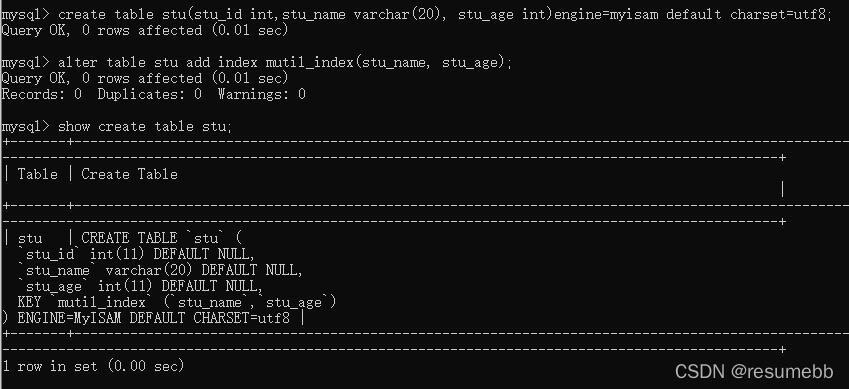 例如:创建一个学生表,根据已存在的表创建多列索引: