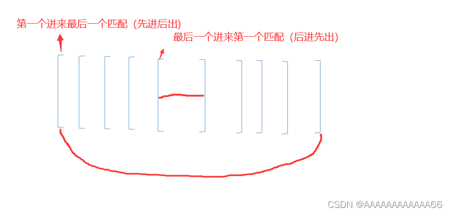 - 如果匹配到右括号就进行出栈操作(符合栈先进后出,后进先出的栈特性)