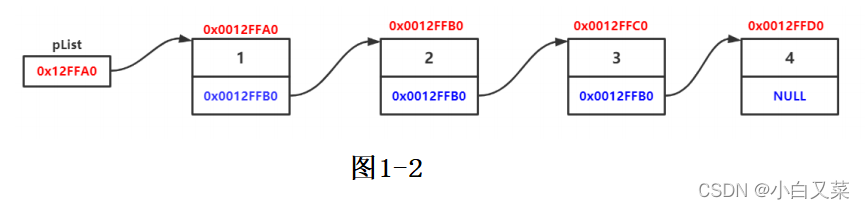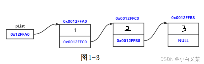 注意:现实中的节点一般都是从堆上申请出来的,从堆上申请的空间,是按照一定的策略分配的,两次申请的空间可能连续可能不连续(如图1-3)。