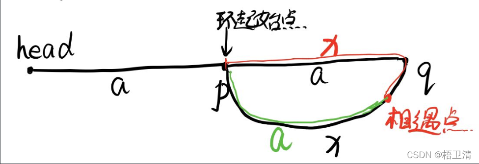(1)假设此时慢指针p位于环起始点,p与head之间的距离为a,即环起始点距离head为a,则此时,q距起始点为2a。