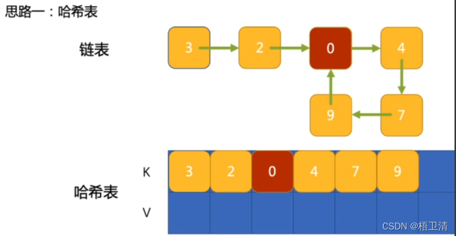 ????????依次遍历整个链表,并创建一个哈希表来存储遍历过的节点。在存入哈希表之前,先判断哈希表中是否存在该节点,如果不存在,则存入哈希表。如果已存在,说明遍历到了重复节点,链表有环。如果遍历到next节点为null的节点,说明没有环。