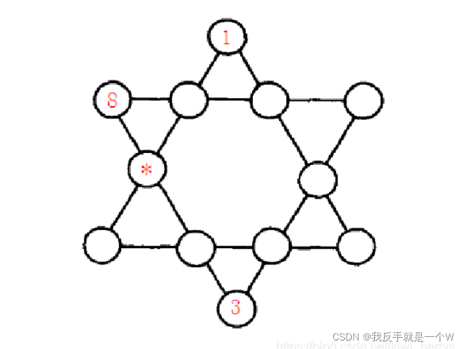 题目描述 如图【1.png】所示六角形中,填入1~12的数字。 使得每条直线上的数字之和都相同。 图中,已经替你填好了3个数字,请你计算星号位置所代表的数字是多少?