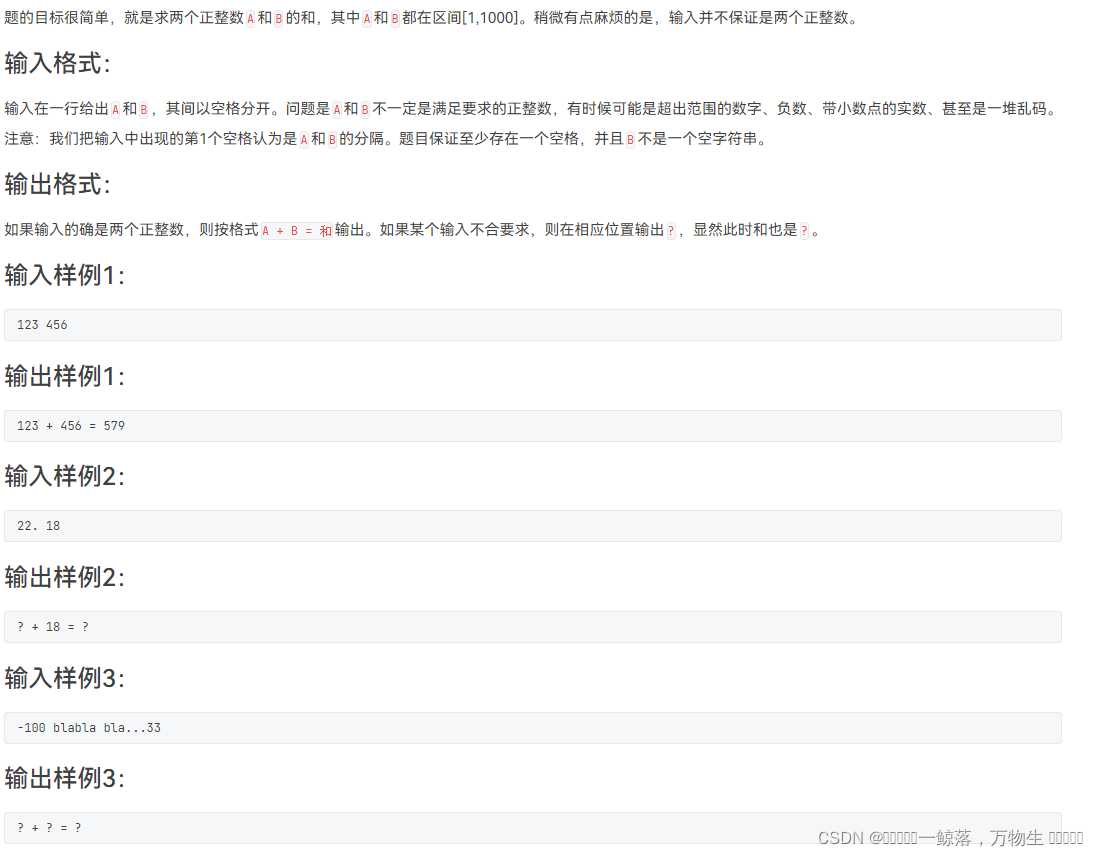 一开始看到这个题是因为看到这个题的通过率比较低,所以想进来踩一下坑,然后果然深陷泥潭无法自拔,一遍写下来顺利的WA在了第3个测试点,然后。。。。。,然后就调不出来了QAQ,后来查了一下,直接无语,来说说第3个测试点吧,第3个测试点是第二个字符串的开头是空格,我当时用的是单纯用string进行读入,只跳过了第一个空格,一遇到像这样的情况就寄了,所以建议第一个字符串正常读入,再读入第一个字符串后用一个getchar()读掉第一个空格,然后用getline读入后面的内容就可以了(好恶心)。