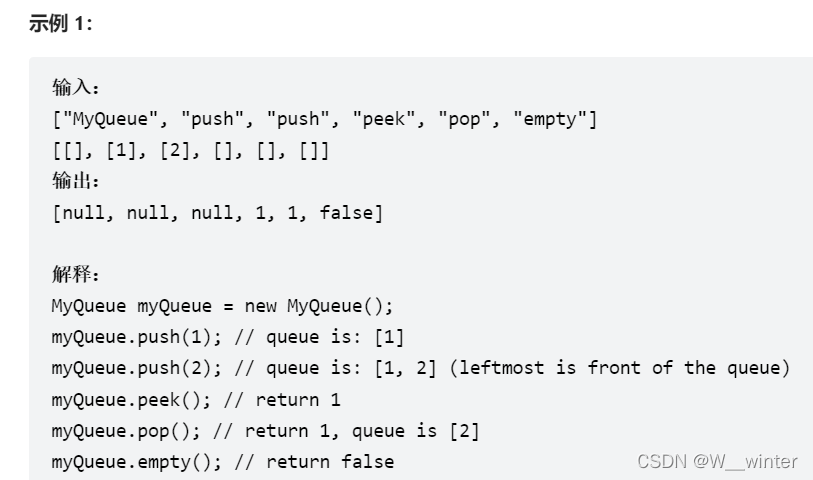 void push(int x) 将元素 x 推到队列的末尾 int pop() 从队列的开头移除并返回元素 int peek() 返回队列开头的元素 boolean empty() 如果队列为空,返回 true ;否则,返回 false