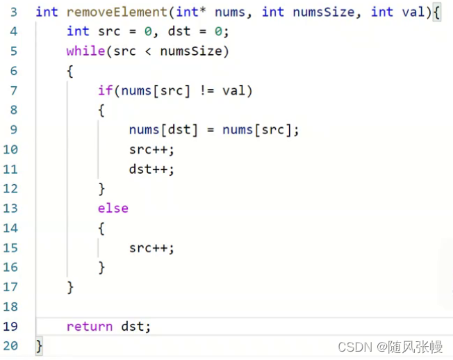 3.使用两个指针src和dst,src++往后遍历,如果src解引用不是val就放到dst中然后dst++