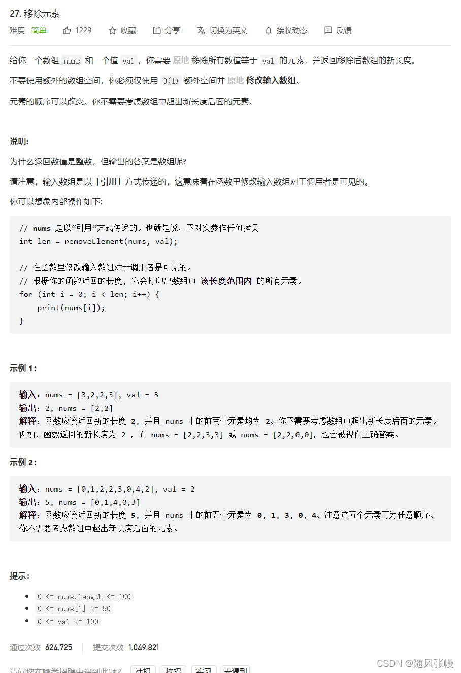 习题链接:27. 移除元素 - 力扣(LeetCode) (leetcode-cn.com)