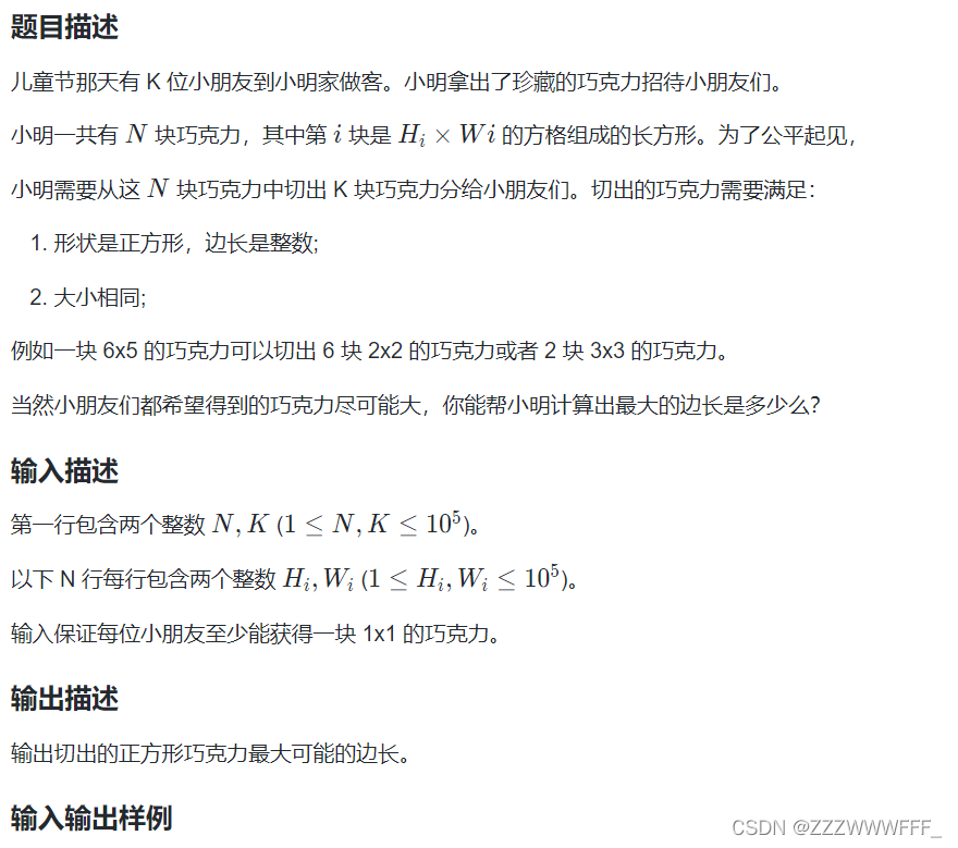 总体来说我们的思路就是,枚举切出的正方形巧克力边长,然后分别用我们所拥有的巧克力的长和宽来除以我们的枚举边长,得到的二者相乘我们就能得到该块巧克力能分出的该种边长的块数了,直到我们找到最大的能分出的巧克力块数即可break了