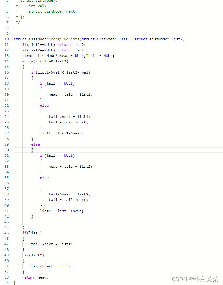 4、特殊情况:当list1或者list2有某一链表为空时,返回另一个链表
