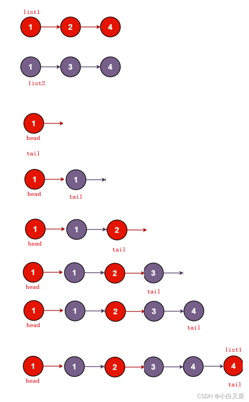 1、比较list1->val和list2->val,如果list1小,这时list1的头结点,就将是新链表的头结点,合成链表中此时只有这一个元素,因此我们将head和tail都赋为list1,由于list1第一个节点比较完了,因此将list1走向下一个节点。list1=list1->next。
