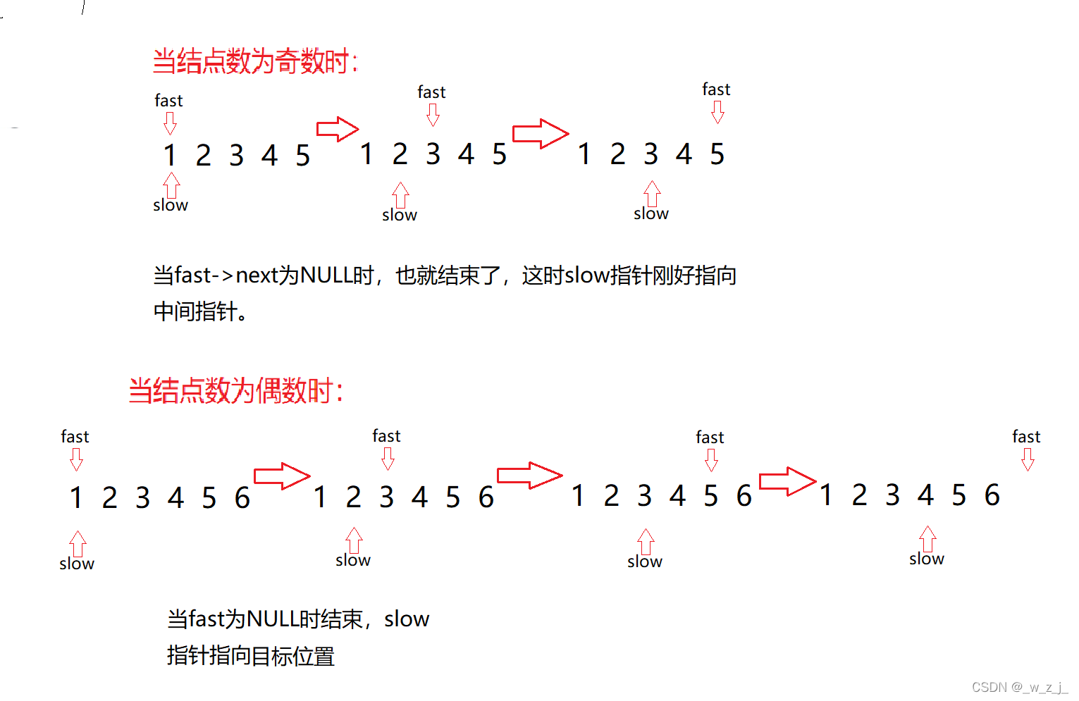 用快慢指针分析:大致可以分为奇数个结点和偶数个结点两种情况。创建两个指针变量,一个为slow指针,一个为fast指针。slow指针一次走一步,fast指针一次走两步,走到最后fast指针走过的长度一定是slow指针走过的二倍。此时fast为最后一个结点(偶数结点时为NULL),slow为中间的那个节点(偶数结点时为中间靠后那个节点)。最后返回slow指针即可。