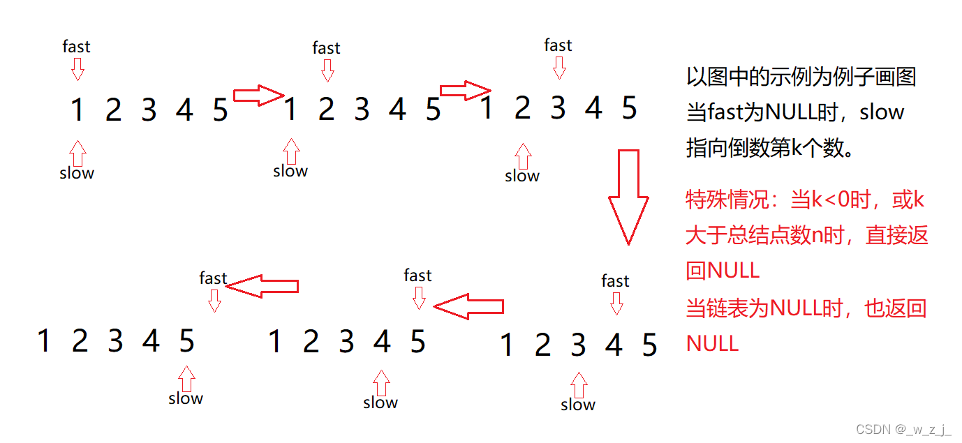 分析:创建fast和slow两个指针都指向第一个结点,先让fast走k步,然后fast和slow一起走。这样一来fast和slow之间永远相差k步,当fast走到最后时,slow正好走到倒数第K个结点。返回slow。