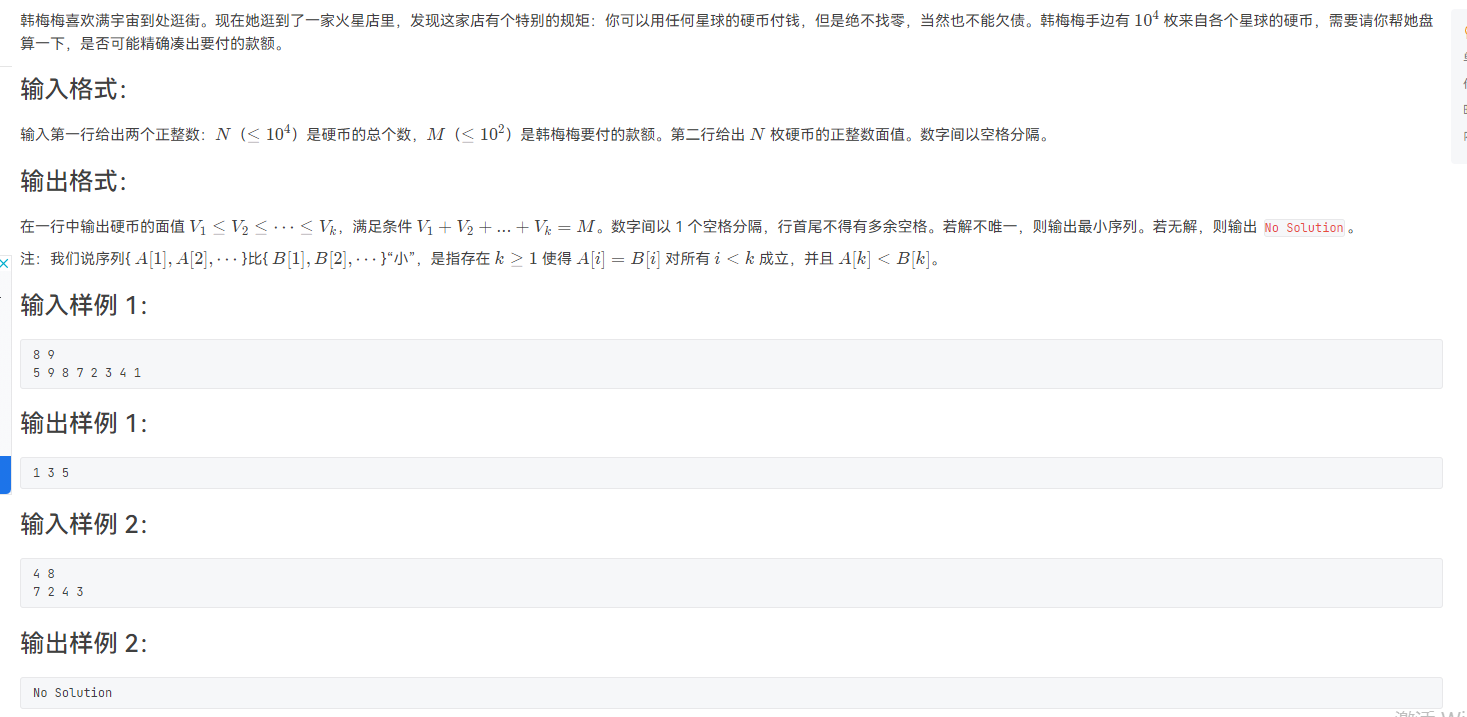 解题思路:本题乍一看好像挺简单,就是个背包问题呗,但是一看要输出字典序最小的路径就懵逼了,所以这个题的难点在于如何记录路径。现在从头开始说,这个题可以看成是一个01背包问题,只不过体积和价值都是m罢了,然后要求输出字典序最小的路径,因为要输出字典序最小的路径,所以我们首先要对输入的序列从大到小进行排序,为啥来?因为当我们在做01背包时,如果在后面出现了合法方案会将前面得到的方案给覆盖掉,所以要把越小的数放在越后面,这样求出来的数就是最小字典序方案了,接下来难点来了,如何记录路径?开一个pre[][]数组,如果说当前我们在第i个物品处对体积为j的dp数组(f数组)做了修改,就将pre[i][j]=1,说明在寻找最优解的过程中来到过这一步,然后倒着找走过的状态,然后输出就行,这里不知道怎么用语言来表达QAQ,还是看代码比较好。
