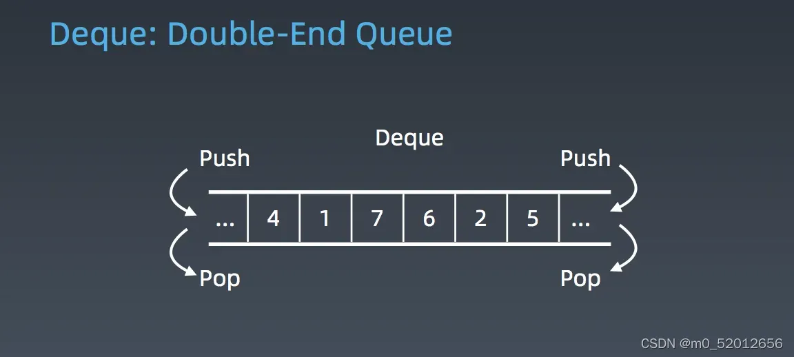 它是一种双开口的连续空间数据结构(与队列没有关系),双开口的含义是可以再两端进行插入删除操作,且时间复杂度为O(1),与vector比较,头插效率比较高,不需要移动数据,与list比较,空间利用率高。