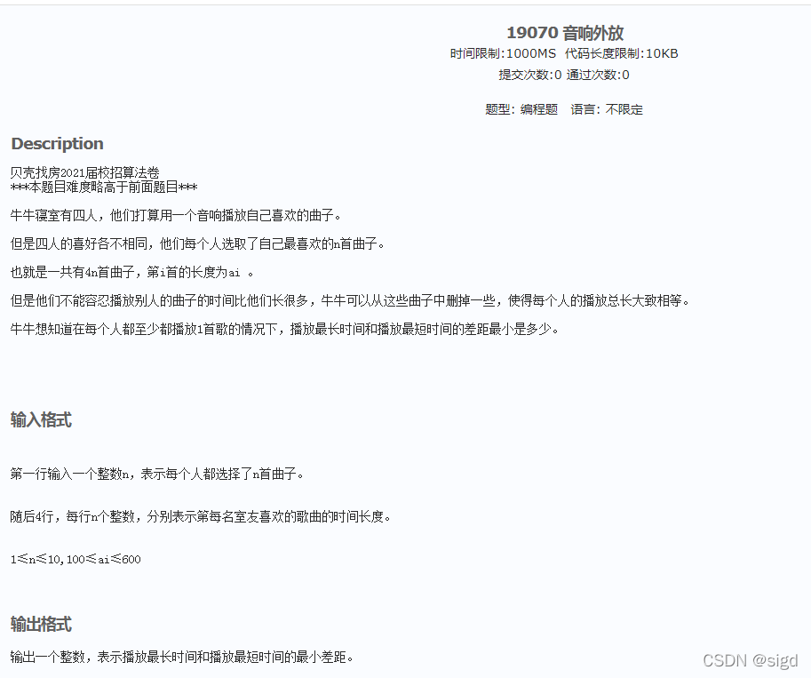 发现此题目枚举是有条件可利用,即四个人最大最小差距尽可能小。因此,总会有一个人,他选择的曲子是四个人中最短的。 我们可以先假设第1个人选择的曲子长度X一定是所有人里面最小时间(X最多1024种可能),那么其他人一定比第1个人的值X大,找到其他三个人比X大的最小值,求出差。 然后我们又假设第2个人选择的曲子长度Y一定是所有人里面最小的,参照第一个人处理方法,再来一次。 然后我们又假设第3个人选择的曲子长度Z一定是所有人里面最小的,再来一套处理。 然后我们又假设第4个人选择的曲子长度V一定是所有人里面最小的,再来一套处理。 在上述枚举过程中必然可以找到答案。复杂度为O(2^2n)。