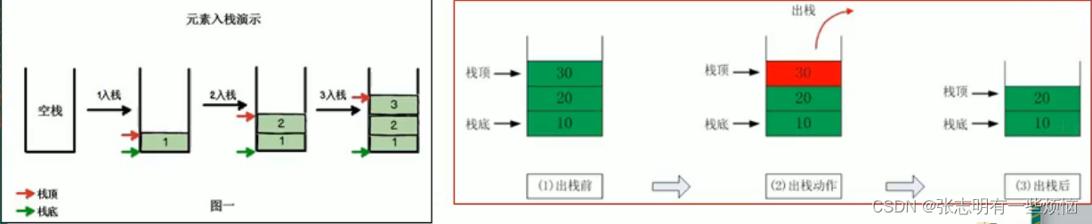 栈(stack)的定义 ? ? ? ? ①栈是一个先入后出的有序链表 ? ? ? ? ②栈是限制线性表中元素的插入和删除只能在线性表的同一段进行的一种特殊线性表? ? ?允许插入和删除的一段 为变化的一端 称为 栈顶 另一端为固定的一端 称为栈底 ? ? ? ? ③根据栈的定义可知 最先放入栈中元素在栈底 最后放入的元素在栈顶 而删除元素刚好相反 ? ?最后放入的元素最先删除 最先放入的元素最后删除