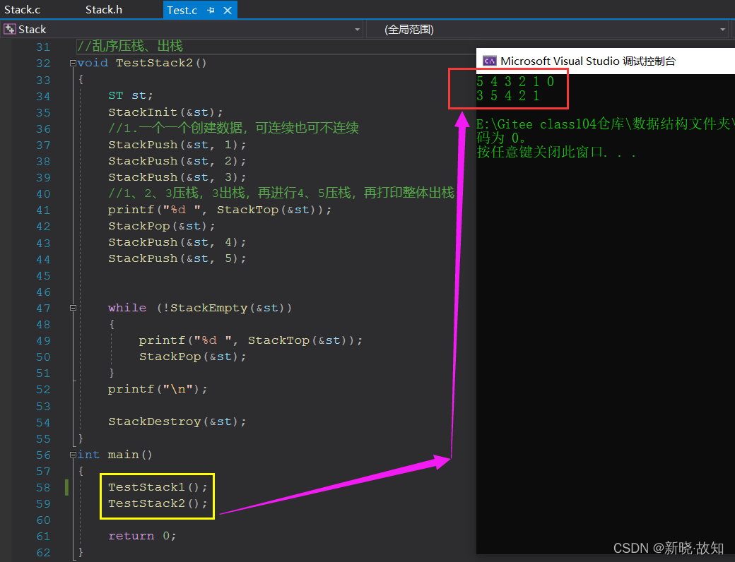 栈(动态版)的功能实现(<入栈,出栈>&<顺序,乱序>)测试示例: