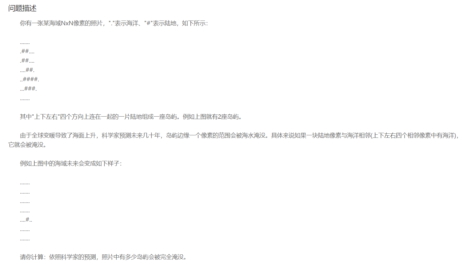 链接: 全球变暖.  贴一道力扣题,和这个相似:链接: 200. 岛屿数量.