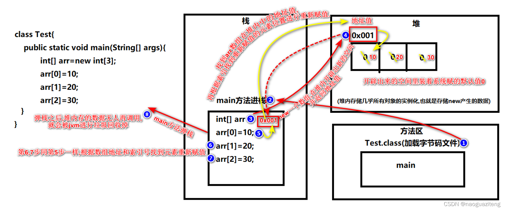 for (int i=0;i<arr.length;i++){ //索引从0开始,所以i最开始为0,遍历的索引号为0,1,2.所以比数组的长度要小