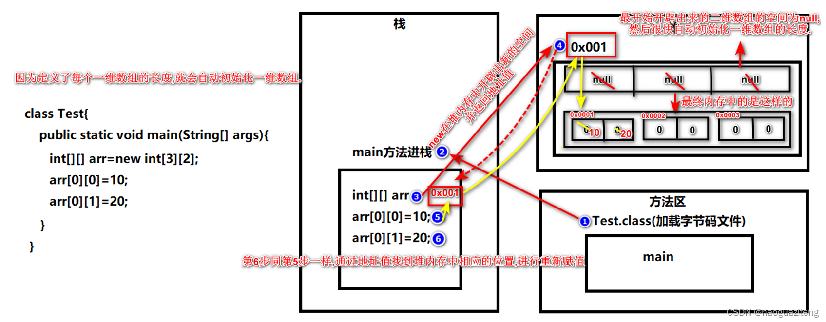 如果定义二维数组时,指定了一维数组的长度,就会开始自动初始化一维数组的长度.内存图如下:
