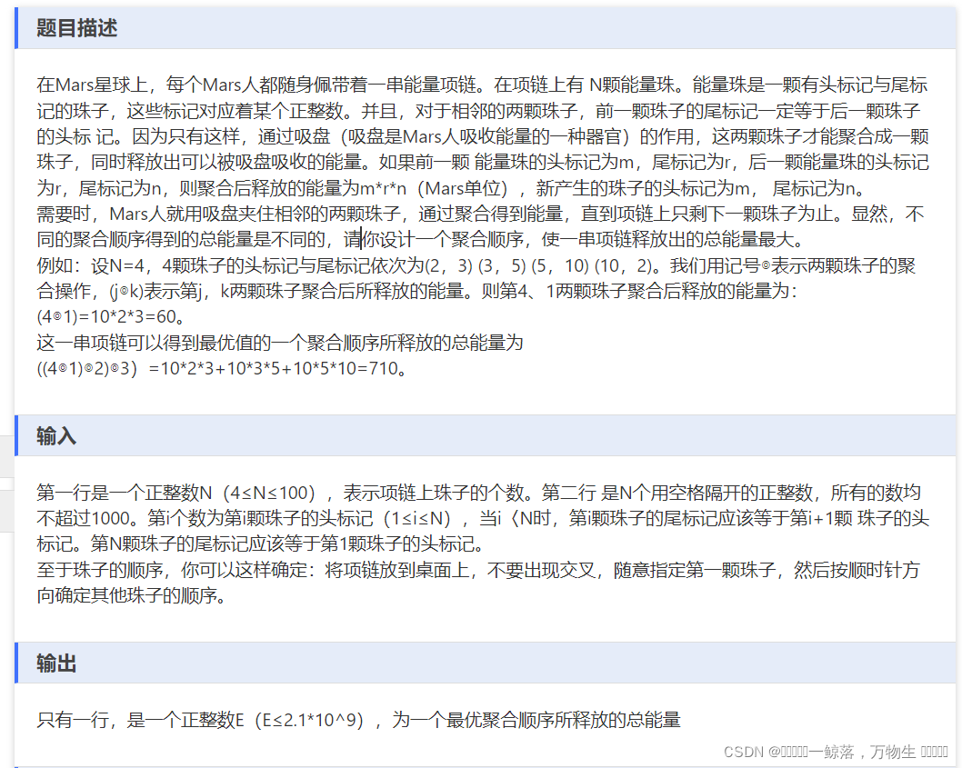 回到正题,终于了解了正确题意的我,不由自主的被偷瞄到的答案带到了区间DP上来,额,还是先来说下题意把,给我们了n个数,第i个数表示第i个珠子的头表示是ai,它的尾节点是它的后一个数(第i+1个数),我们对每两个珠子可以进行合并操作,合并后会释放一定的能量,释放的能量=前一个珠子的头标记*后一个珠子的头标记*后一个珠子的尾标记,每次只能是按顺时针进行合并,就是相邻的2个珠子,左边的和右边的合并,合并后2个珠子变成一个珠子,谁先合并没有要求,注意这串珠子是围成一个圈的,题目要我们输出释放能量的最大值。想到这里不难看出这是一个非常典型的区间DP问题,它和环形石子合并问题几乎就是一模一样的,思路比较简单看代码就能看明白,就是在枚举中间变量k的时候需要思考一下从那一段来枚举。