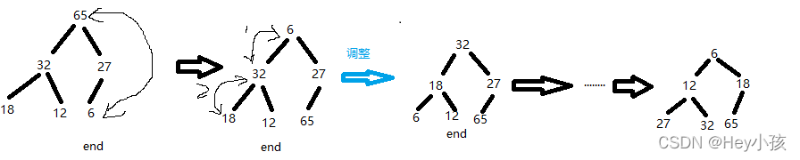 利用堆删除的思想来进行堆排序,将堆顶与末尾位置进行交换,然后对堆重新调整使之重新成为一个堆,每交换一次堆顶,末尾位置标记向前移动1,直到调整完整个序列,完成堆排序。